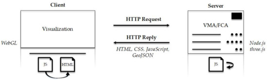 Currently, the algorithms have been developed into a client-side application, which requires good computer memories and processing capacities. In order to develop a real RESTful web application, the visualization and processing stages shall be respectively divided into the client and the server (similarly than [48]). As the algorithm has been implemented in JavaScript, it could be carried out with an environment server such as Node.js. In Figure 14, the application is divided into a client (any HTML5-compatible browser) who visualizes the 3D geospatial data through the WebGL API, and a server that processes the data based on two libraries: Node.js and three.js. In a first step, the client would load, filter, map and render the 3D geospatial data. Then, the viewpoint management and flythrough creation algorithms would be remotely launched on the server thanks to the WebSocket API. Ultimately, the results would be sent to the client who could thereby visualize the objects of interest in an efficient way, either statically and/or dynamically into an automatic computer animation.