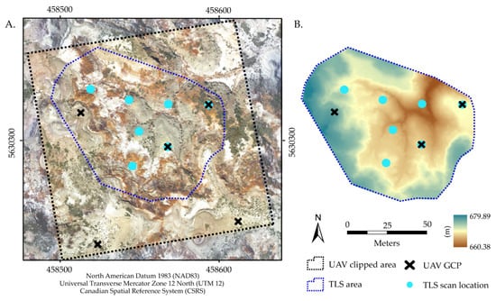 (A) Field location with UAV and terrestrial laser scanner (TLS) data extents, ground control points (GCPs), and TLS scan locations; (B) digital surface model (DSM) of the field area used for data assessment.