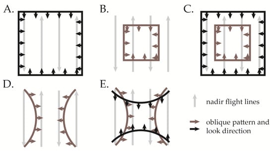 Oblique combination scenarios (A) outside box, BoxO; (B) inside box, BoxI; (C) inside and outside box, BoxIO; (D) single convergent arcs; (E) double convergent arcs. Note light-grey lines represent north–south (NS) nadir image flight lines.