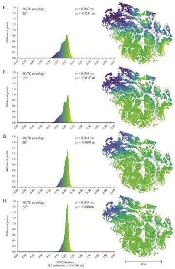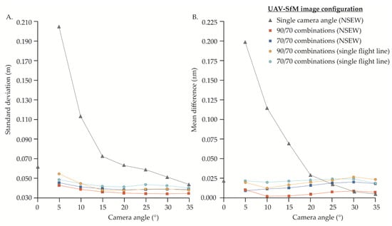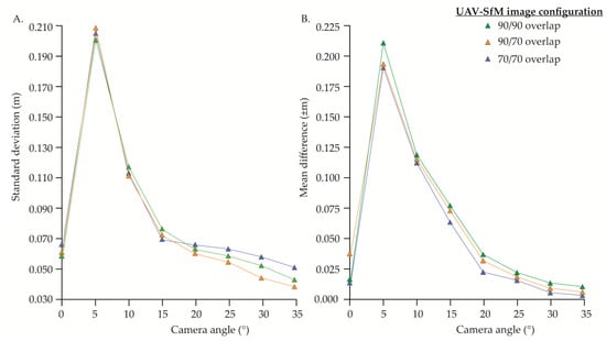Image blocks collected with a single camera angle and cross-hatch flight lines produced complete datasets with smaller data gaps for all overlap scenarios (70/70, 90/70, and 90/90). Datasets collected with a single camera angle always resulted in higher standard deviations (lower precision) of M3C2 distance measurements between UAV–SfM and TLS models than combination datasets (Figure 3A) and usually had means further from 0 (lower accuracy) than combination datasets (Figure 3B). Single-angle datasets with high tilt angles (25–35°) had mean values similar to or smaller than combination datasets (Figure 3B). High tilt angles usually resulted in standard deviations lower than nadir-only datasets and higher than combination datasets (Figure 3A).