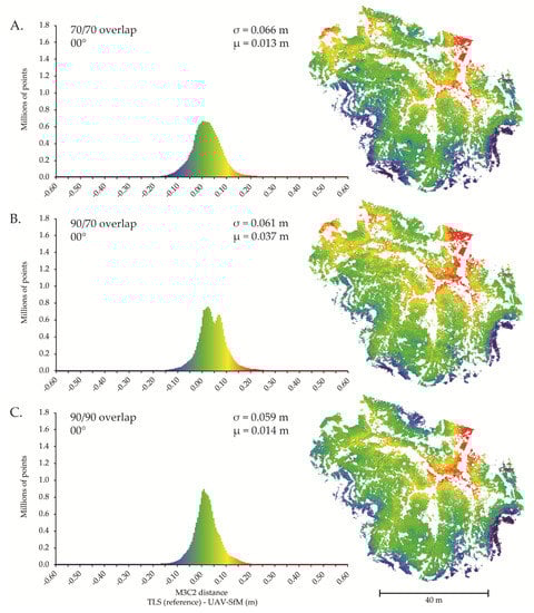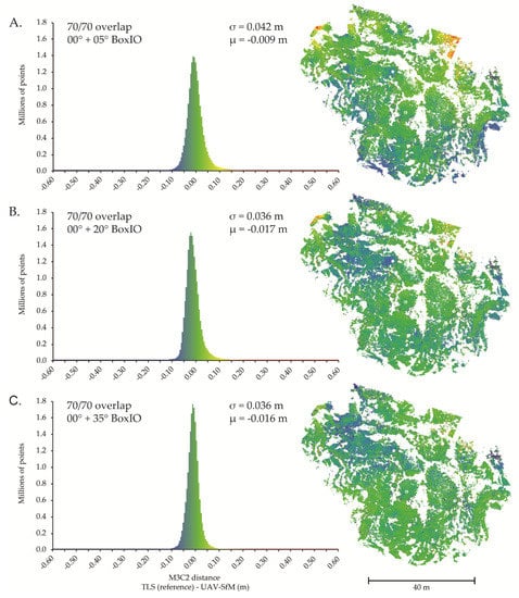 M3C2-calculated distance between TLS reference dataset and UAV–SfM data sets collected with nadir camera angles and cross-hatch flight lines (NSEW) with various image overlap settings: (A) 70/70, (B) 90/70, and (C) 90/90. Positive values indicate UAV–SfM surface above TLS reference surface; negative values suggest UAV–SfM surface below. Note the systematic distribution of error with low points (near the center of the field area) higher than the reference dataset and high points (near the perimeter of the field area) lower than the reference dataset. This systematic error is similar to that noted by James and Robson [] and is present regardless of overlap.