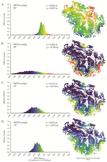 Results are based on M3C2 distances, which are calculated in the direction of surface normals of the reference point cloud, rather than strictly vertical distances. Relating results and GCP residuals to the topography of the field site (Figure 1B) suggests that vertical error is more prevalent than horizontal. Differences between the TLS reference dataset and UAV–SfM datasets could be attributed to inconsistencies/deformation of reconstructed surface shape (relative accuracy), georeferencing errors (absolute accuracy), or a combination of both. Within this investigation, TLS data was considered as the reference dataset because of its superior precision and a final georegistration error of 0.013 m. UAV–SfM datasets had resulting precisions more than a magnitude higher than the TLS, but GCP residuals in UAV–SfM datasets were generally comparable. This suggests that deviations between the TLS reference dataset and various UAV–SfM scenarios were primarily a result of differences in surface shape in the dense point clouds. Some datasets, however, exhibited large inconsistencies in both georeferencing and surface shape, most notably 05–10° (Figure 6B,C), which had vertical RMSE values up to 0.13 m.