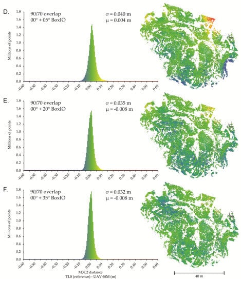 M3C2-calculated distance between TLS reference dataset and UAV–SfM combination image sets: (A) 70/70—05° BoxIO; (B) 70/70—20° BoxIO; (C) 70/70—35° BoxIO; (D) 90/70—05° BoxIO; (E) 90/70—20° BoxIO; (F) 90/70—35° BoxIO. See Figure 2 for description of flight patterns. Positive values indicate UAV–SfM surface above TLS reference surface; negative values suggest UAV–SfM surface below.