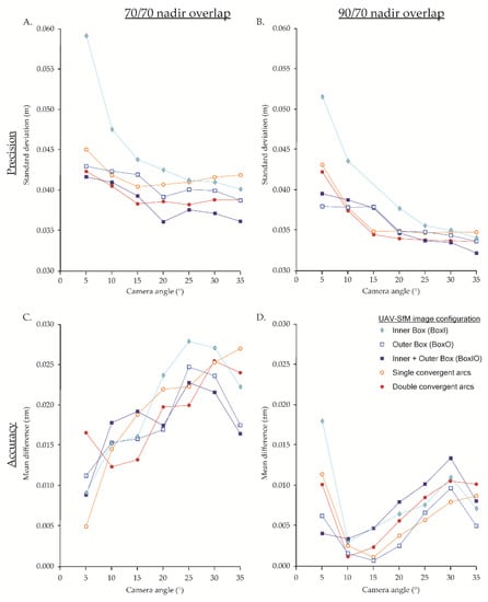 Image configuration of supplemental oblique images had some effect on UAV–SfM dataset precision and accuracy (Figure 8). The inner box (BoxI) and single convergent arc patterns (Figure 2B,D, respectively) generally resulted in the highest standard deviations and means farthest from 0 compared to datasets with similar overlap and camera angle. Outer box (BoxO), inner/outer box (BoxIO), and double convergent arc patterns (Figure 2A,C,E) usually resulted in highest precisions; double convergent arcs were more effective for low angles (10–15°), while box patterns were slightly more effective for high angles (25–35°), particularly for the 70/70 overlap scenario (Figure 8A). Mean difference values were also affected by different oblique image configurations, although results were less consistent. Oblique flight patterns resulting in small means (closest to 0 m) varied considerably within the 70/70 overlap scenario (Figure 8C), while the 90/70 scenario typically had smallest means for single convergent arcs and BoxO patterns and largest mean values for BoxIO and double convergent arc patterns (Figure 8D).