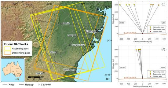 Overview of the Envisat SAR database used within this paper: (a) footprint of ascending and descending Envisat SAR images in the Sydney region, and position of Envisat satellite at time of image acquisition from the seven orbital tracks in E–U plane (b) and in N–U plane (c).