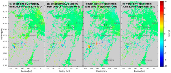 Multi-geometry data fusion of Envisat InSAR data: (a) ascending LOS velocities (track 152), (b) descending LOS velocities (track 359), (c) estimated E velocities, (d) estimated U velocities from data fusion of seven geometries. The circle indicates the defined stable area common to all seven InSAR analyses and used as spatial reference. Coordinate axes: UTM, zone 56.