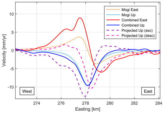 The fusion of LOS velocities is performed on a pixel-by-pixel basis on the interpolated grid nodes. This approach also enables other geodetic data to be incorporated if available, such as GNSS or levelling observations [61,62]. Furthermore, it is possible to fuse InSAR-derived LOS measurements from different SAR sensors and with different operating frequencies (X-band, C-band, L-band; see reference [68]). We apply least-squares adjustment (LSA) to the interpolated LOS velocities (observation vector ), solving for velocities in the E, N and U directions (unknown parameters ):