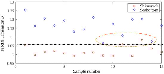 The value of fractal dimension (D) calculated by Side Scan Sonar (SSS) images of shipwreck and sea bottom. The black dotted line represents the feature distinguishing value. The elliptical labeling area are the samples difficult to be recognized.