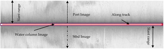 In SSS imaging, a sonar array is typically mounted on either side of a towfish or an autonomous underwater vehicle (AUV). Two fan-shaped beams are transmitted perpendicular to the towfish or AUV travel path, and starboard (stbd) and port SSS sea bottom images are formed through received beam forming. During the transmitting pulse, the receiving circuitry is switched off to prevent damage or saturation of the high-sensitivity amplifiers. After the completion of the transmitting pulse, the transducers are switched over to the receiving circuitry, and the continuous recording of the incoming acoustic signal begins. The signals scan a swath of the sea bottom from a point just below the towfish to a limited distance away from the line of travel (slant range) on both sides [30], and this forms a ping measurement. A series of pings can be obtained continuously in SSS measurements, and a waterfall image will finally be formed by these ping measurements, as shown in Figure 3. The water column image is formed due to the transmitting time of the acoustic wave through the water before the first reflected sound wave from the seabed.
