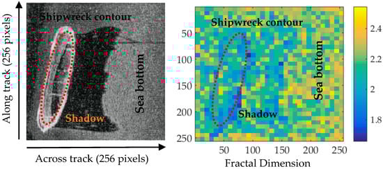 Shipwreck image and its fractal dimension (D), the raw SSS image is referenced from [33]. The red ellipse marked area demonstrate the shipwreck contour.
