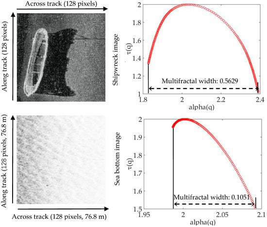 Multifractals were calculated by the box-counting method [21]. Experiments were carried out by using SSS image of shipwreck target and natural sea bottom background of sandy slope, with uniform image sizes of 128 × 128 pixels. The numerical results of the multifractal width are shown in Figure 7. It can be seen that the multifractal width of the underwater shipwreck target was 0.5629, and that of the sea bottom image was 0.1051. The multifractal width of the SSS image of the man-made shipwreck target is larger than the natural sea bottom background image. Figure 2 and Figure 7 both demonstrate that multifractals’ width can be used to recognize the shipwreck target from SSS sea bottom image.