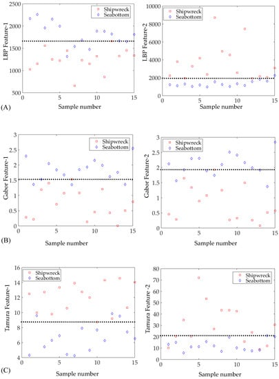The value of other texture features calculated by SSS images of shipwreck and sea bottom. The black dotted line represents the feature distinguishing value. (A) shows the first two dimensions of local binary pattern (LBP) features, (B) shows the first two dimensions of Gabor features, (C) shows the first two dimensions of Tamura features.