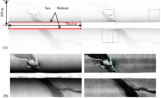 The shipwreck target recognition result in area I. (A) The raw SSS image is used for the experiment; (B) The radiation distortion corrected image is used for the experiment.