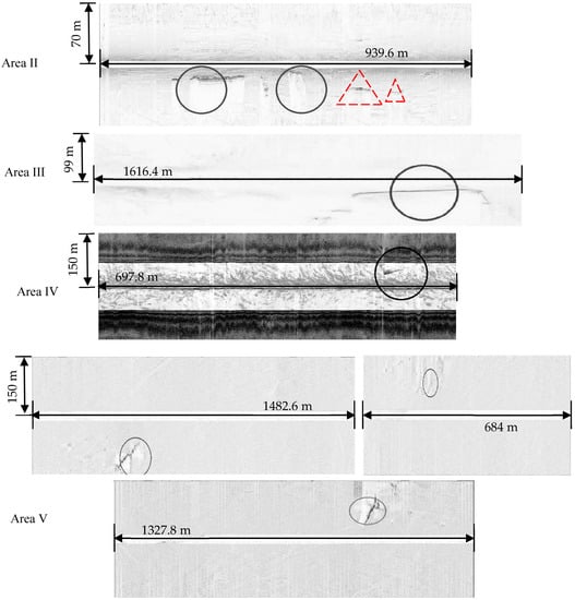 It can be seen from the areas marked by the red triangle shown in Figure 10, area II, that the two shipwreck-like broken areas were not recognized in the SSS waterfall image. In the experiment, this was caused by the missing detection during the nonlinear matching model process used for the target detection step. The shipwreck recognition was not applied in these regions. The model given in the process could solve the problem of time-consuming of exhaustive searches methods, although it reduced the shipwreck correct recognition rate.