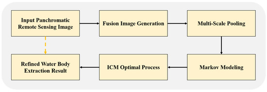 Based on the fusion feature multi-scale pooling description, we propose a Markov modeling method combined with an ICM optimal process to generate the final refined water body extraction result. Figure 7 shows the proposed Markov modeling framework for extracting refined water bodies.