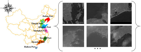 Seven Chinese ports were chosen as study areas as shown in Figure 3. Shanghai is a famous port in China, and it is one of the largest freight ports and economic centers. Qingdao port is located in Jiaozhou Bay in Shandong Peninsula, and is the second largest port of external trade with an annual capacity of 100 million tons. Qingdao port is an important international trade port and a maritime transport hub on the western coast of the Pacific Ocean. Tianjin port is a comprehensive and important external trade port, and is the highest artificial deep-water harbor of the world that was built by digging seas and reclamation on muddy shoals. Shenzhen port is a world-famous global container port, with wharf berths for the largest cruise ships. Dalian port is the most advanced transshipment base for bulk liquid chemical products in Asia. Xiamen port is a natural harbor on the southeastern coast of China. In 2017, its annual throughput was 10.38 million TEUs ranking 14th in the world. Haikou is a new port area. In the future, it will become an important logistics center. All panchromatic water-land scenes images were collected from these ports, and the images were collected to include variance water area (i.e., calm water, weak waves, strong waves, and polluted water) and land area (i.e., vegetation, buildings, shadows, and thin cloud cover) to demonstrate the effectiveness of the proposed method.