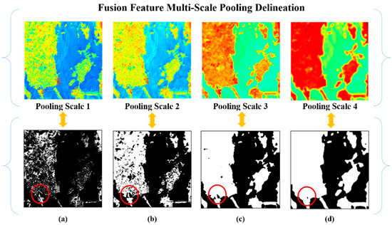 Figure 5, provides an example of different pooling scales in the proposed fusion feature multi-scale pooling delineation method. In first line of Figure 5, multi-scale pooling is presented as the series of multi-scale pooling description from small to large scales. For the large pooling scale description result in the first line Figure 5c,d, the land area has a strong aggregated response compared with small scales Figure 5a,b, which means there is an obvious feature difference between water and land areas. Corresponding to the binary masks of different pooling scale feature maps, on the second line in Figure 5, the red circle area shows the edge structure location is maintained in small pooling scale description Figure 5a,b, and area integrity is maintained with large pooling scale description Figure 5c,d. In general, the proposed water body fusion feature multi-scale pooling delineation method contains detailed local edge structure, as well as global area integrity information.