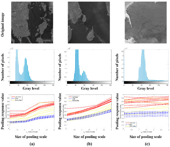 Discriminative feature description analysis of fusion feature multi-scale pooling for water and land area. (a–c) are original panchromatic images with their corresponding gray level histograms and fusion feature pooling response curve statistics.