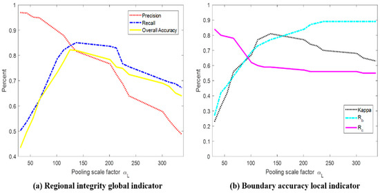 The performance discussion of different scale factor αL setting with single pooling scale description. (a) shows the global indexes for regional integrity evaluation, (b) shows the local refined indexes for boundary accuracy evaluation.
