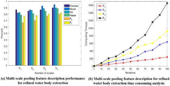Multi-scale pooling feature description analysis. (a) shows the performances of multi-scale pooling feature description with different number of pooling scales for refined water body extraction, (b) shows time consuming of multi-scale pooling feature description with different pooling scales.