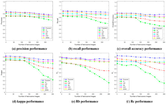 Performance comparison analysis based on selected dataset. (a) is precision performance of selected dataset, (b) is recall performance of selected dataset, (c) is overall accuracy performance of selected dataset, (d) is precision performance of selected dataset, (e) is Rb performance of selected dataset, (f) is Rc performance of selected dataset.