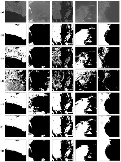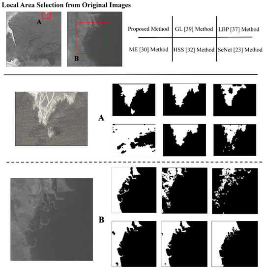 To demonstrate the effectiveness of our proposed method, we individually chose gray level based [39], texture feature based [37], and entropy based [30] methods for comparison with our proposed method. The gray level (GL) method [39] uses a morphological operator (e.g., Top-hat) to enhance land cover area because default water areas are darker than land areas. Then, the mean and variance values of land area are employed to achieve water body extraction. Texture feature based methods [37] used the local binary pattern (LBP) as the texture feature descriptor to produce distinguished description, because the default water area has a flatter texture characteristic than land areas. Maximum entropy (ME) based method [30] employ the topology segmentation model to achieve coarse water body extraction, and maximum entropy features and morphology operations are used to merge several separated coarse segmentation areas and achieve refined water body extraction. The hierarchical sea-land segmentation (HSS) method [32] and convolutional neural network (CNN) based method SeNet [23] were also considered for comparison. The HSS [32] method uses hierarchical analysis and gray level combing with texture features to achieve water body extraction, and SeNet [23] uses a special constraint loss function and a large manually annotated dataset to achieve refined water body extraction. Their performance evaluations are shown in Table 4 and Figure 11.