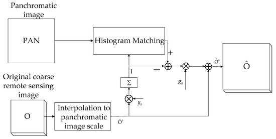where PAN is the panchromatic image ( = 1, 2, …, B), B is the number of spectral bands in the original image) is the bth spectral band, is the original coarse remote sensing image; is the improved image. represents the bth spectral band of the improved image, is the bth spectral band of the original image, which is interpolated at the scale of the panchromatic image, and = [, , …, ] is the vector of the injection gains., while I is given as: