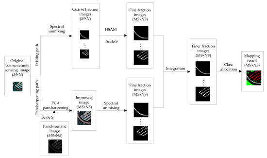 Step 1. In the existing path, the coarse-fraction images are derived from the original coarse remote sensing image by spectral unmixing. At the same time, the resolution of the original image is improved by the pansharpening technique in the pansharpening path.