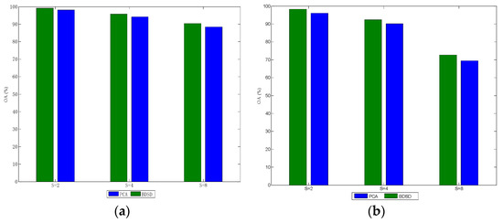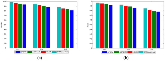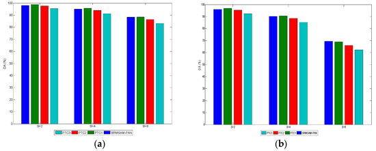 (a) OA (%) of the SRMSAM-PAN results in relation to the band-dependent spatial detail (BDSD) and PCA in Experiment 2. (b) OA (%) of the SRMSAM-PAN result in relation to BDSD and PCA in Experiment 3.