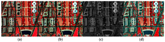 (a) RGB composites of the image (bands 102, 56, and 31 for red, green, and blue, respectively). (b) Coarse image () (c) Panchromatic image. (d) Pansharpening result.