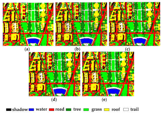 The reference image in Figure 10a showed six classes, containing shadow, water, road, tree, grass, and roof. Figure 10b–e gives the mapping results of four methods. With the help of the pansharpening technique, the mapping result was more continuous, and the boundaries were smoother in Figure 10e. The SRMSAM-PAN was visually closer to the reference image, compared to the other three SRMSAM methods.