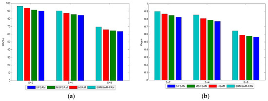 Consistent with the results in Experiment 1 and Experiment 2, we also evaluated the four SRMSAM methods for three zoom factors, i.e., 2, 4, and 8. Checking the OA (%) and Kappa in Figure 14a,b, the quantitative evaluation from SRMSAM-PAN was higher than the other three SRMSAM methods.