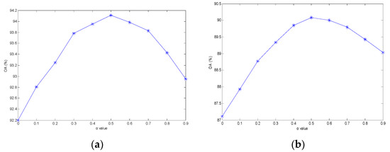 (a) OA (%) of SRMSAM-PAN in relation to the weight parameter in Experiment 2 (). (b) OA (%) of SRMSAM-PAN in relation to the weight parameter in Experiment 3 ().