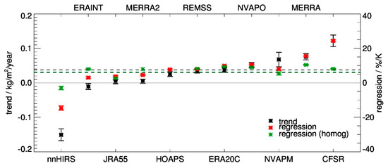 Trend estimates in TCWV in kg/m2/year and regression coefficients in %/K for eleven data records. Also shown are regression coefficients which have been computed using homogenised TCWV data records (see text for details). TCWV values have been averaged over the global ice-free ocean within 60°N/S and cover the common period 1988-2008. The vertical bars show the estimated uncertainty of the trends and the regression coefficients. The black dashed lines mark the typically expected range of regression values given in, e.g., [30], while the green dashed line marks the expectation, computed using observed SST. The light grey line marks the zero line. Recall that the use of the trend analysis is to identify issues in the data records and it is not claimed that these are the trends occurring in nature.