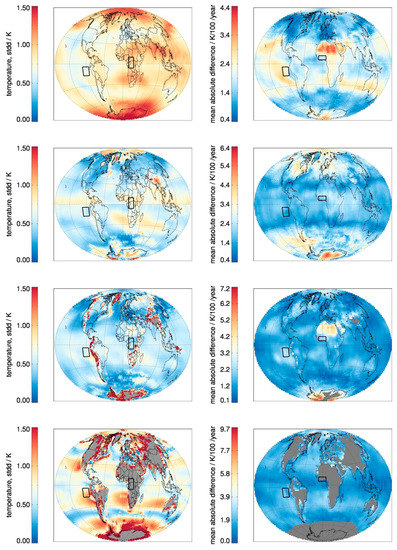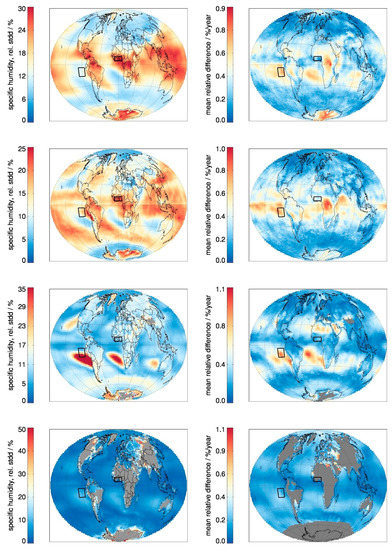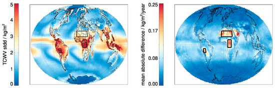Spatial maps of standard deviation (left) and mean absolute differences in trend estimates (right, updated from [35]. Both panels have been computed using all eleven TCWV data records covering the period 1988–2008. The black boxes mark the regions of central Africa, Sahara and South America.