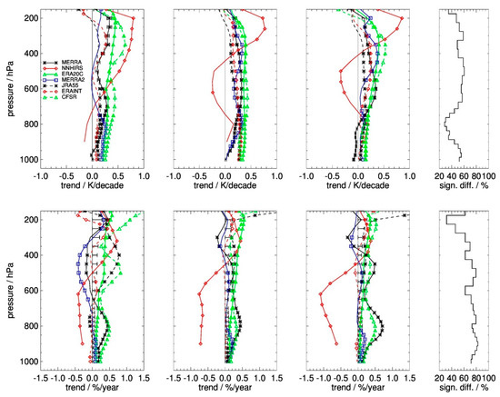 Trends in temperature (top) and specific humidity (bottom) as a function of pressure: left column—tropics (within 20°S–20°N), second column—mid-latitudes of the northern hemisphere (within 20°N–60°N), third column—mid-latitudes of the southern hemisphere (within 20°S–60°S). Note that vertical profiles have not been interpolated onto a common vertical grid. Asterisks mark trend estimates which are significantly different from 0%/year or 0 K/decade. For MERRA the uncertainty estimate for the trend is also included. The right column shows the average percentage of data records being significantly different from one another. Note that the x-axis covers the range 20–100%. The results are based on seven data records that cover the period January 1988–December 2009.