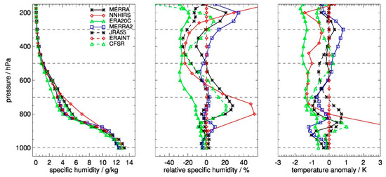 - Pincus, R.; Beljaars, A.; Buehler, S.A.; Kirchengast, G.; Ladstaedter, F.; Whitaker, J.S. The representation of tropospheric water vapor over low-latitude oceans in (re-)analysis: Errors, impacts, and the ability to exploit current and prospective observations. Surv. Geophys. 2017, 38, 1399–1423. [Google Scholar] [CrossRef]