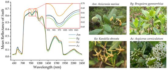 The mean smooth (Smth) reflectance spectrum and photos of four mangrove species.