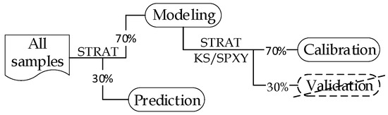 According to the suggestion of Roth et al. [62], to ensure the modeling and prediction sets contained samples of each species, the original dataset (301 samples) was first divided into two sets with STRAT, using 70% (211) of samples for modeling and 30% (90) of samples for prediction (Figure 4). The reason for this partition strategy of selecting the prediction sets was that the KS and SPXY algorithms selected sample subsets based on the Euclidean distances of x-space or x and y space which resulted in an unbalanced prediction sample size of four species. Afterwards, the modeling set was divided into two sets, with 70% (148 samples) being used as a calibration set to construct species classification models and the remaining samples (the validation set) being eliminated due to the aforementioned influence of KS and SPXY. Each process of sample subset partitioning was repeated 50 times to ensure the reliability of the classification results [63].