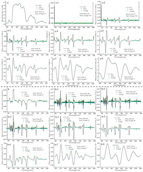 Plots of the mean reflectance (a), derivative (b), and wavelet power spectra of Smth (a-1, a-2, … a-8) and Der (b-1, b-2, … b-8) with eight scales (taking Am species for instance).