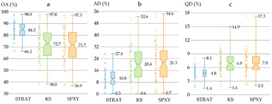 The box plots of the OAs (a), ADs (b) and QDs (c) of the 270 models with the stratified random sampling (STRAT), Kennard-Stone sampling algorithm (KS), and subset partition based on joint X-Y distances (SPXY) methods. Each box has three whisker labels representing the maximum, mean, and minimum values for each dataset from top to bottom. The box width represents SD and a comparatively wider box width indicates a larger SD value.