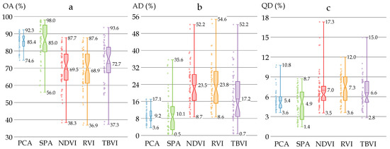 The box plots of the OAs (a), ADs (b) and QDs (c) of the 270 models using PCA, successive projections algorithm (SPA), normalized difference vegetation index (NDVI), ratio vegetation index (RVI), and three bands vegetation index (TBVI). Each box has three whisker labels representing the maximum, mean, and minimum values for each dataset from top to bottom. The box width represents SD and a comparatively wider box width indicates a larger SD value.