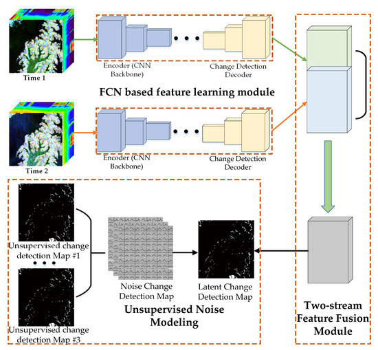 Considering these problems, how to effectively utilize the rich spectra information in high dimensionality and distinguish useful information from noise in an unsupervised way is an important field of research [15,48,49,50]. In this work, a novel perspective on noise modeling-based unsupervised fully convolutional network (FCN) framework for HSI change detection task is proposed. The proposed end-to-end framework learns the latent change detection map by excluding the noise in change detection maps of existing unsupervised methods. We consider how to improve the performance by the training of the FCN without labeled data in order to obtain the final change detection map. To this end, this paper develops a novel end-to-end unsupervised framework, consisting of three modules: the FCN-based feature learning module, the two-stream feature fusion module, and the unsupervised noise modeling module. These three modules work natively to jointly improve the change detection accuracy. To sum up, the main contributions of this work can be summarized as follows.