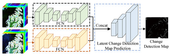 In change detection task, the two HSIs are captured at the same position but different times. Thus, the same FCN-based networks are employed to extract the deep features to make sure that the features of two HSIs are in the same space. Considering H S I 1 and H S I 2 as two input HSIs, the feature extraction of them with the FCN-based network can be formulated as