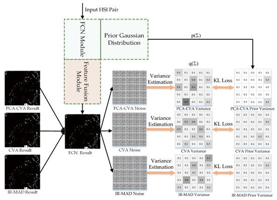 Figure 4. This figure illustrates the training details of the proposed denoising module. In this module, the latent change detection map generated by the FCN network is subtracted by the unsupervised training datasets to obtain the noise map. Then, we train this module to minimize the Kullback–Leibler (KL) divergence between the noise distribution and the prior Gaussian distribution. Finally, a noise excluded-change detection map is obtained when this module converges.