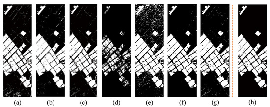 Figure 6. The change detection maps of different methods for the dataset of farmland, (a) the change detection map of CVA, (b) PCA-CVA, (c) IR-MAD, (d) SVM, (e) CNN (f) GETNET, (g) our method, and (h) ground-truth map.