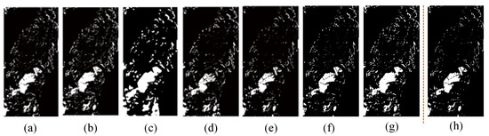 Figure 8. The change detection maps of different methods for the dataset of Poyang lake: (a) the change detection map of CVA; (b) PCA-CVA; (c) IR-MAD; (d) SVM; (e) CNN; (f) GETNET; (g) our method; and (h) ground-truth map.