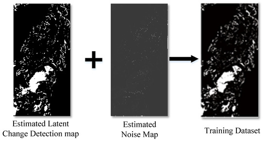 As mentioned above, the proposed FCN-based network firstly learns the latent change detection map, which then is trained to generate the ‘true’ change detection map with the training dataset Y p and the noise modeling module. Since no ground truth labels are used in this work, it is still an unsupervised framework for the change detection task and works in an end-to-end manner. For the change detection map generation, the cross-entropy loss is employed for supervision. Given the predicted change detection map y t and the training dataset generated from existing unsupervised change detection methods y i , i = 1 , , K , the cross entropy loss L c l s can be computed by