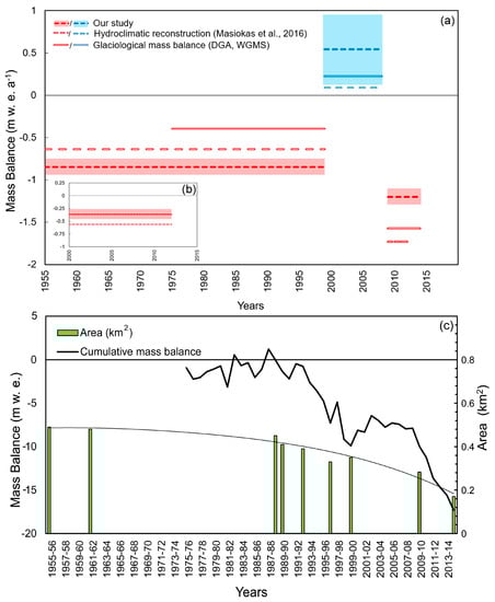 Reported glaciological mass balances should be homogenized to minimize errors due to differences in operators and calculation methods [63]. However, due to the lack of access to the original stakes, we could only compare general trends observed by geodetic and glaciological mass balance. We used the glaciological mass balance data reported by DGA during four-time periods for which DEMs were available (Figure 4a). For the earliest observation periods, data from each method was not directly comparable, as glaciological monitoring started in 1975 only. For the period of 1975–2000, the glaciological mass balance showed a mean rate of −0.40 m w.e. a−1, whereas for 1955–2000, the observed mean geodetic mass balance rate was −0.85 m w.e. a−1 (Table 3). This difference of −0.45 m w.e. a−1 could be explained by the difference in time span between these two estimates, alongside density factors and the uncertainty estimation.