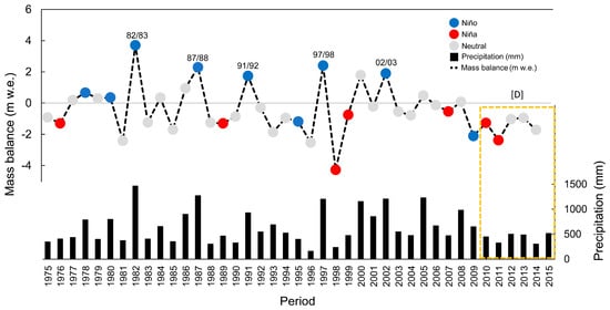 Comparison of the annual mass balance of the Echaurren Norte Glacier between 1975–2015 and annual precipitation between 1975 and 2015 at El Yeso station (black bars). El Niño–Southern Oscillation (ENSO) 3.4 region data were retrieved from the National Ocean and Atmospheric Administration (NOAA). Drought period [D] in orange box [12].
